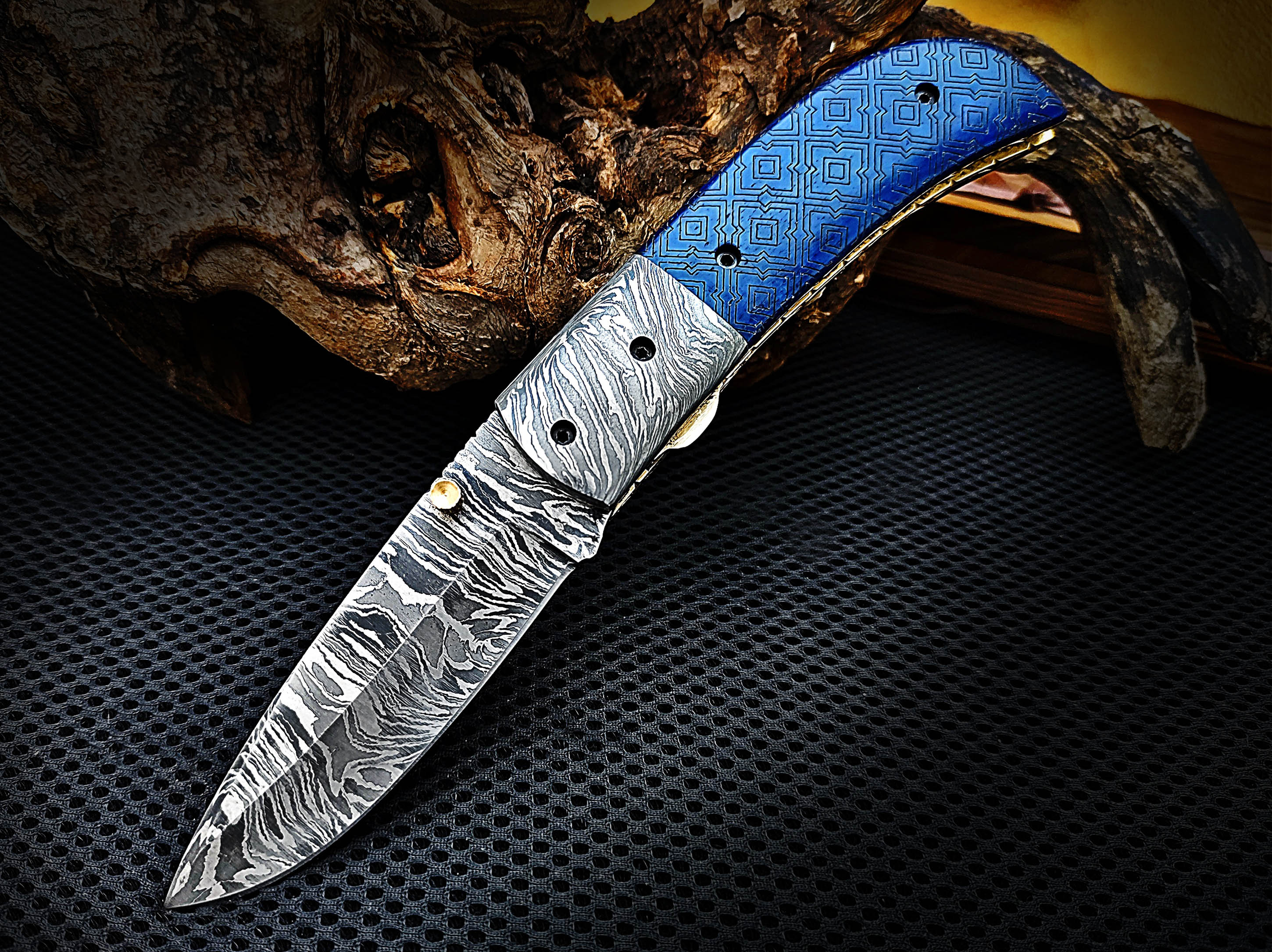 Handle Material: Alien Graphic Laser Engraving on Blue Colored Camel Bone & Damascus bolster