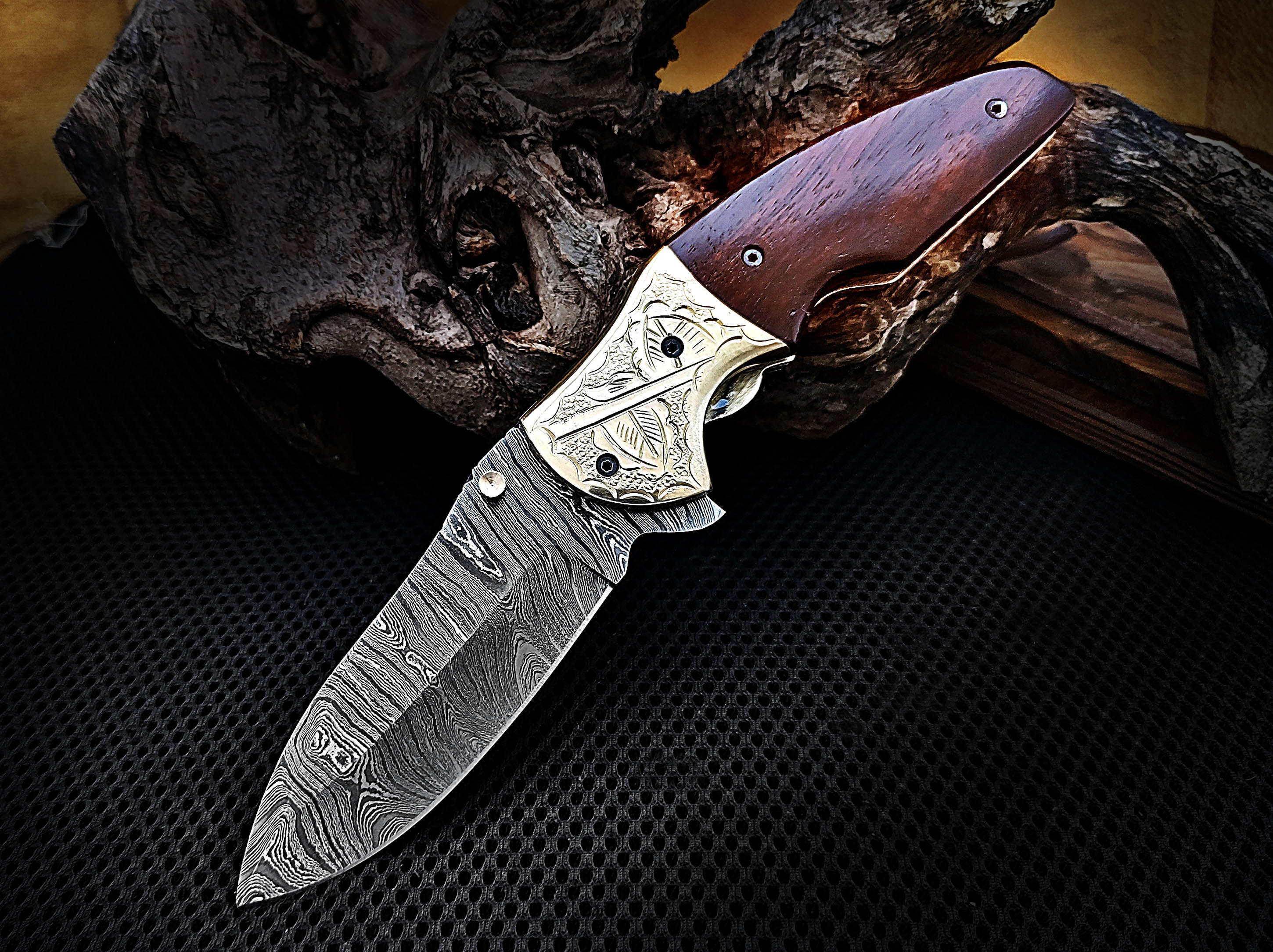 Folding Pocket Knife Walnut Wood Handle and Engraved Brass Bolster 8.0 inches Custom Handcrafted Damascus Steel with Leather Sheath Perfect Gift for Your Loved Ones CLKFOL1105