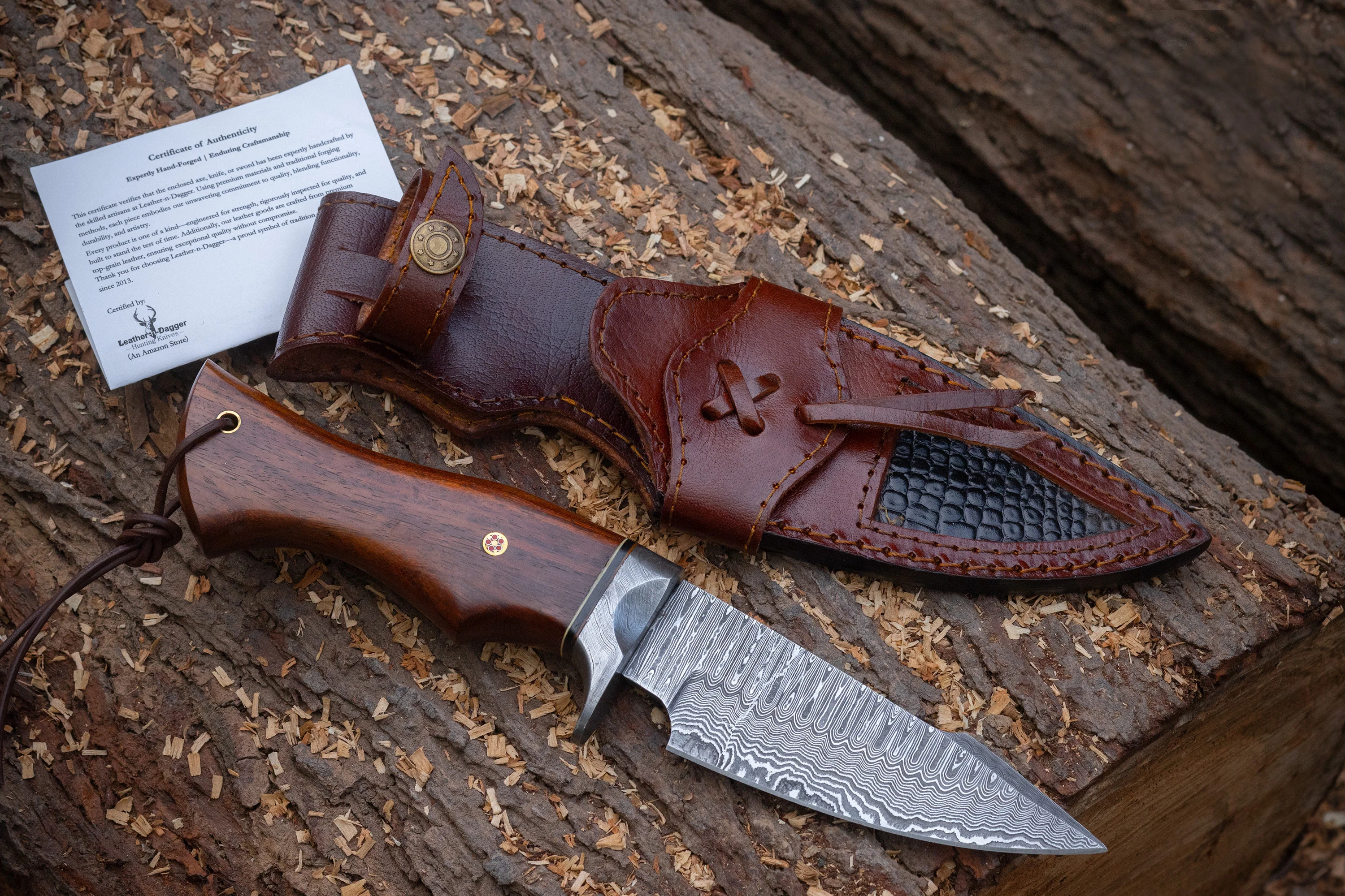 Hand-Forged Damascus Bushcraft Hunting Knife Walnut Wood Handle – Hidden Tang with Leather Sheath LDK02