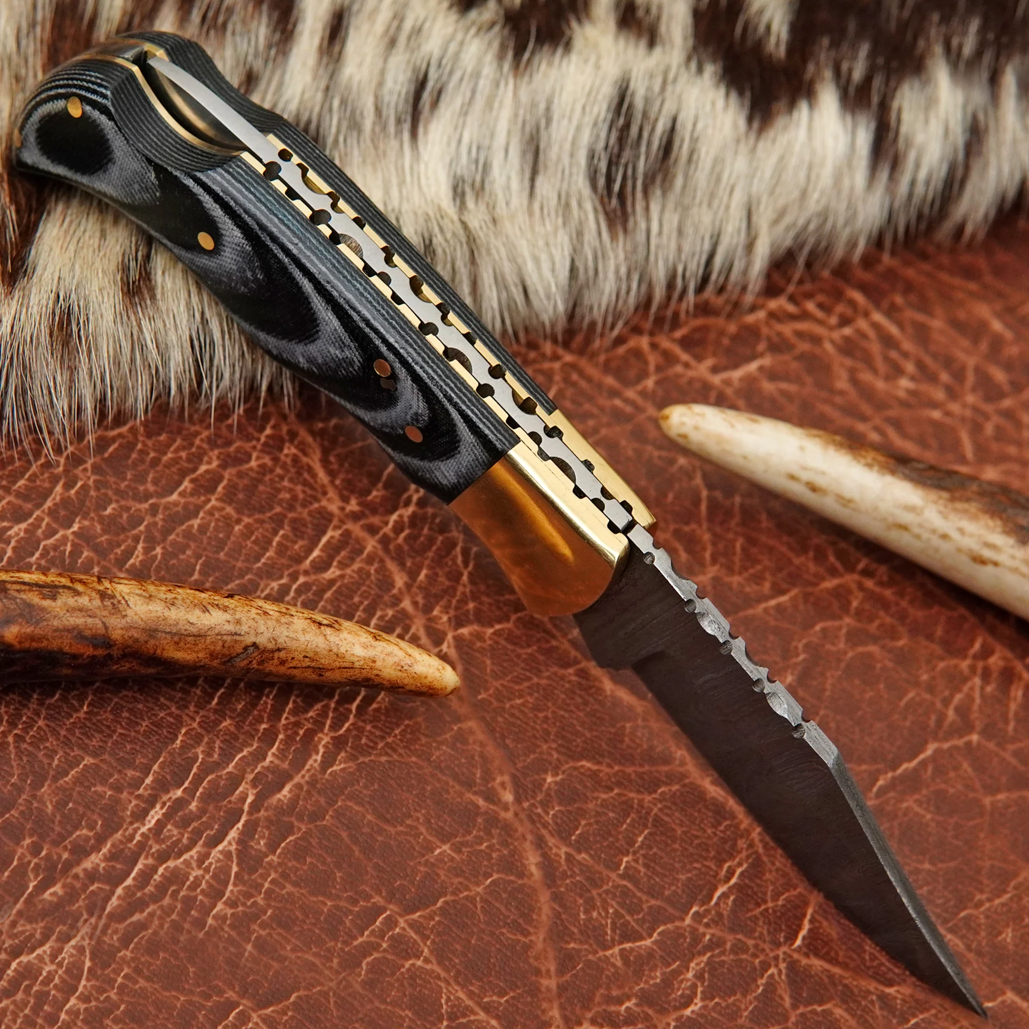 Pocket Folding Knife EDC Hand Forged in Damascus Steel Brass Bolster and Blue Micarta Handle with Leather Sheath ILFOL01-V4