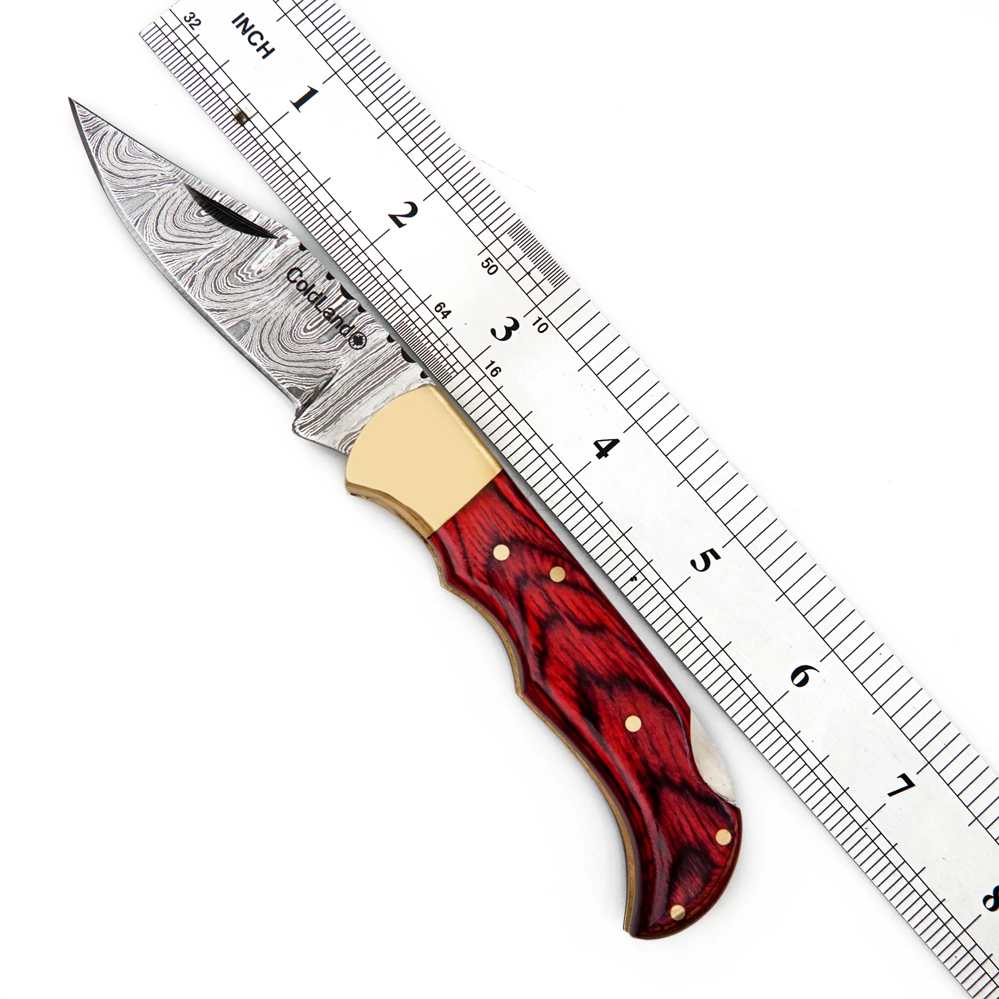 Pocket Folding Knife EDC Hand Forged in Damascus Steel Brass Bolster and Red Pakka Wood Handle with Leather Sheath ILFOL01-V3